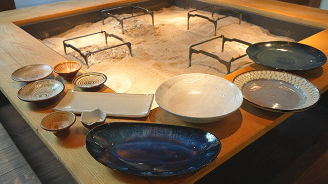 銅製の大きなダクトが目を惹く店内は、随所から木の温もりが感じられる古民家風のデザイン。広々とした美しい庭を眺めながら、地元食材を使用した料理の数々をじっくりお楽しみいただけます。店内のカウンター席は、囲炉裏を使いお客様自身で食材を焼いて楽しめる特等席。囲炉裏を囲う形の掘りごたつ席は、足を伸ばして寛ぎたい食事シーンに最適です。