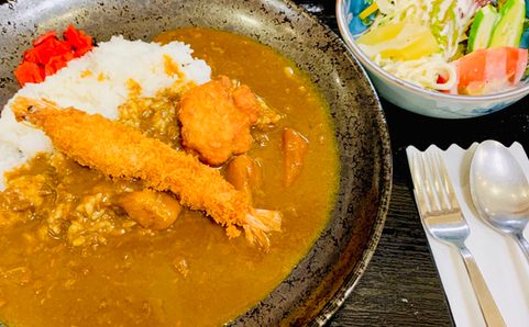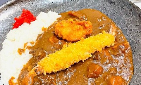 当店自慢の『水陸機動団カレー』は、スパイシーで深みのある味わいが特徴。お客様に愛され続けるこのカレーは、990円で楽しめる絶品メニューです。海老フライや唐揚げが乗ったボリューム満点なカレーをお楽しみください。