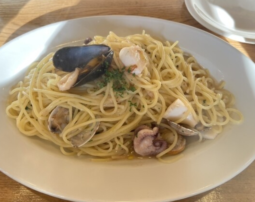 ガーリックパスタは、にんにくが立ちすぎず上品な香り。オイルのコクと塩味のバランスが絶妙で、もちもち食感の麺とよく絡みます。イイダコのアヒージョや鶏肉とズッキーニのゴルゴンゾーラソースなど創作系も豊富。シンプルながら満足度の高い料理が揃います。