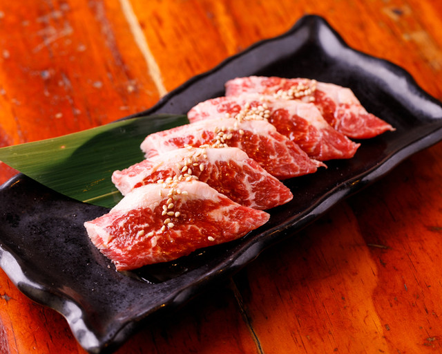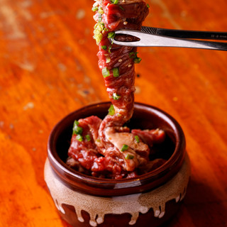 伊藤課長の壺漬けお肉は、すべて店内仕込み。じっくり熟成させたお肉を自慢のタレに漬け込むことで生まれる旨みは、別次元の美味しさです。一本漬けしている「壺漬けハラミ」は、七輪の上をぐるり一周するくらいの大きさ!