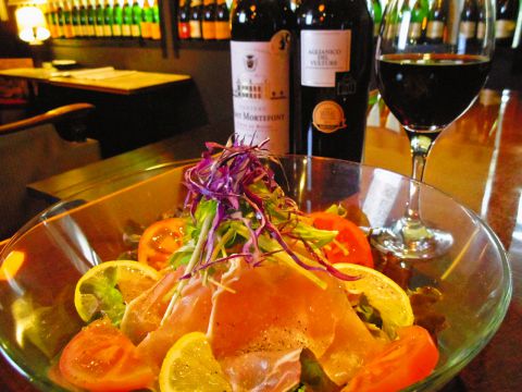生ハムと地元の彩り豊かな新鮮な野菜の盛り合せ。ノンオイルのソースでヘルシーに、さっぱり仕上げた生ハムサラダ。大人の隠れ家へどうぞ。