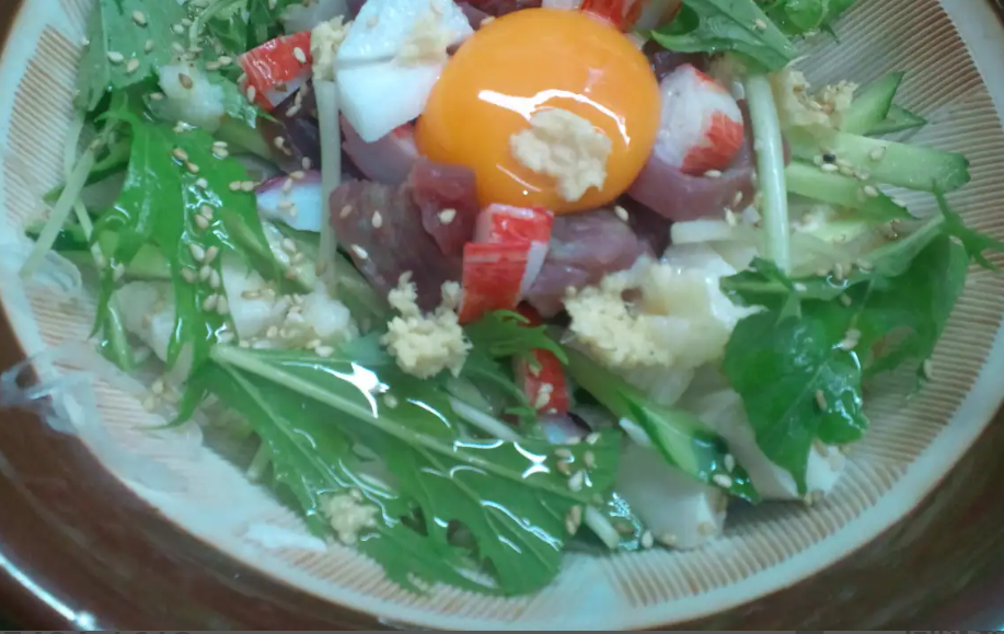 海鮮サラダとやっこが合体したジャンボ奴は、Mサイズで2〜3人様用。女子会でも人気の健康美容メニューです。食べ応え満点の一品!