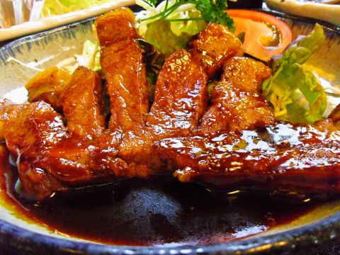 国産豚を使用したトンテキは柔らかく肉厚でとってもジューシー。ご飯にもお酒にもピッタリはまる味。座敷でのんびりするもよし、カウンターでしっぽりも粋だ。