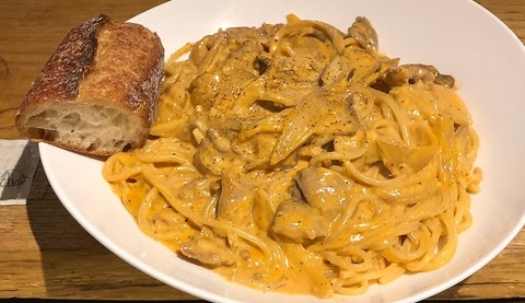 まろやかなトマトクリームソースが魅力のチキン舞茸スパゲティは、リピーター続出の自慢料理。パンとの組み合わせも相性良く、最後までソースを味わいたくなる一品です。明るく落ち着いた店内は家族でも一人でも心地よく過ごせる空間です。
