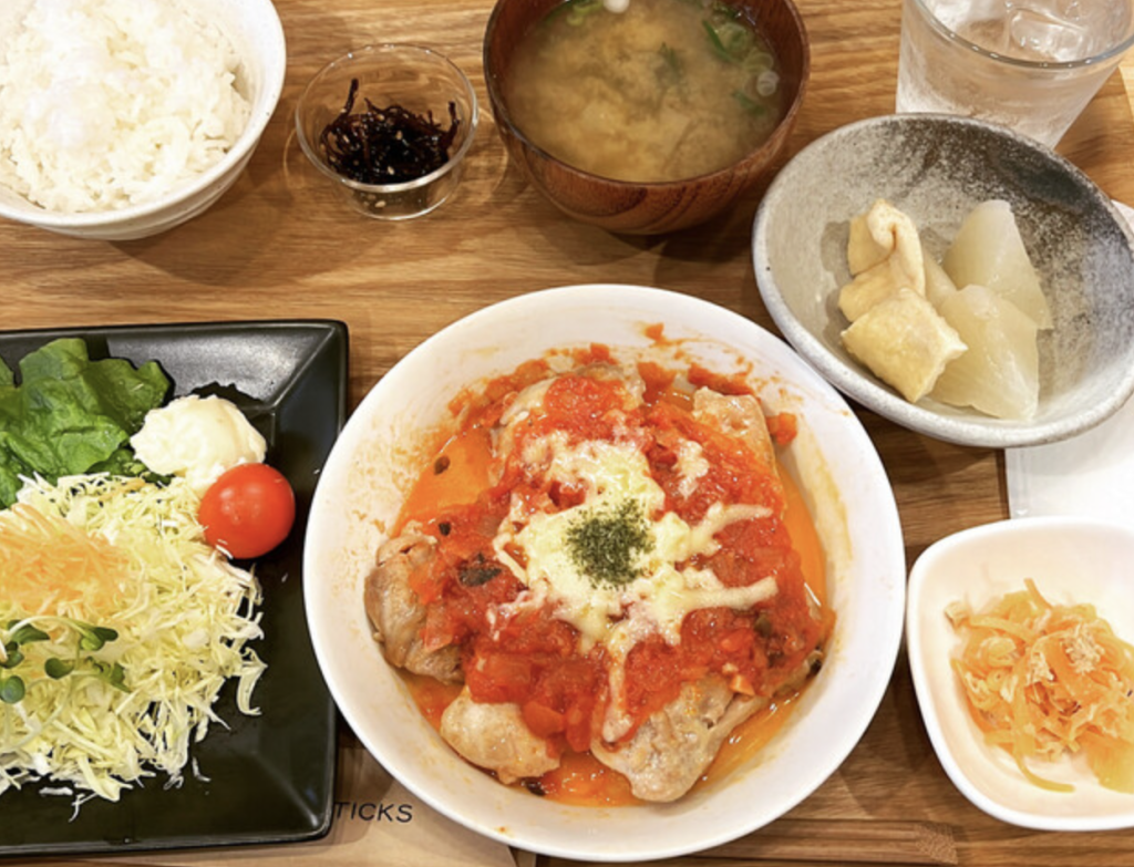 毎日異なるランチメニューを提供しています。小鉢2品とごはん、お味噌汁のセットで、定番のチキン南蛮やグリルチキントマトソースを楽しめます。手作りの家庭的な味わいが魅力です。