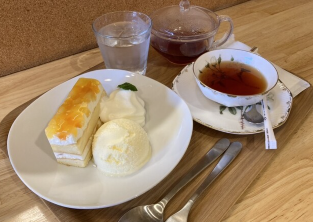 手作りのケーキは、季節ごとに変わる豊かな味わい。りんごとモモのケーキは、ふわふわのスポンジとクリーミーな生クリームが絶妙なバランス。ホットティーもお代わり可能で、心も体も満たされます。