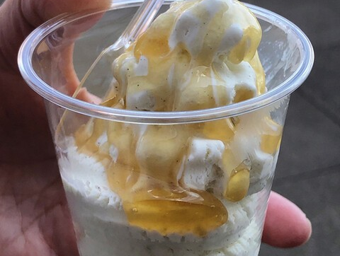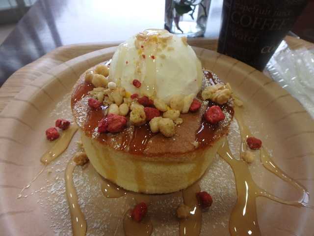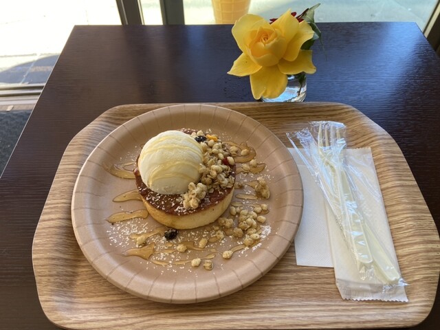 ふわふわのスフレパンケーキにバニラアイス、ポン菓子、そしてたっぷりのはちみつがかかった「はちみつパンケーキドリンクセット」。贅沢な甘さと食感のコラボレーションをお楽しみください。
