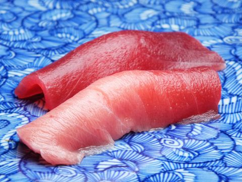 赤身と中トロ。赤酢のシャリは「新鮮なネタを味わって欲しい」ということで親指サイズ程の大きさ。口に入れた時のネタとシャリ、醤油のバランスが丁度良い!