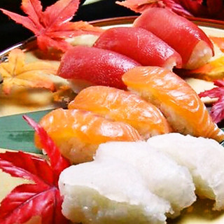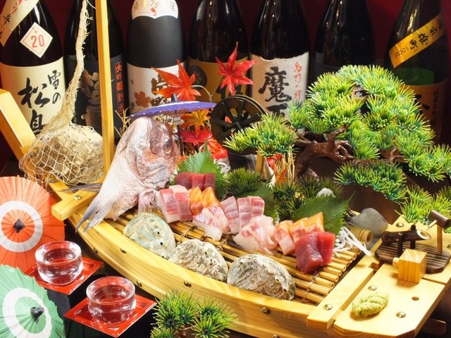 お造りの盛り合わせをはじめとする、豪華な逸品の数々。本クエやとらふぐ、あんこうなどの高級贅沢メニューをはじめ、北海道産の生たこを使用したタコしゃぶしゃぶ鍋やズワイ蟹しゃぶしゃぶ鍋、海鮮の串焼きや天麩羅、少し甘めのシャリがこだわりの握り寿司、こぼれいくら軍艦など、大阪料理・海鮮料理・おすすめ料理、多数取り揃えています。