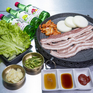 定番の韓国料理「サムギョプサル」のセットもおすすめです!お肉はジューシーな国産豚を使用。キムチ・サンチュ・特製ラー油ダレとともに食べることで、豊かな味わいが口いっぱいに広がります◎2~3人前になりますので、多彩なシーンでシェアしてお楽しみください♪