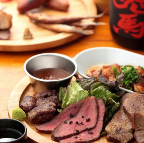 当店の人気名物メニュー! [肉盛りプレート 1,680円][自慢のローストビーフ] [牛サガリのサイコロステーキ] [豚肩ロースの低温柔らか焼き] [鶏モモステーキ〜ニンニク焦がし燻製醤油] 4種の肉盛りは少しずつ食べたい方へおすすめです!