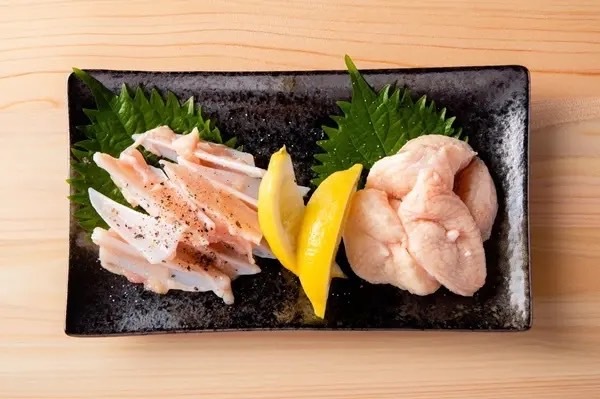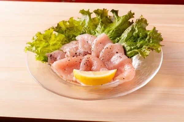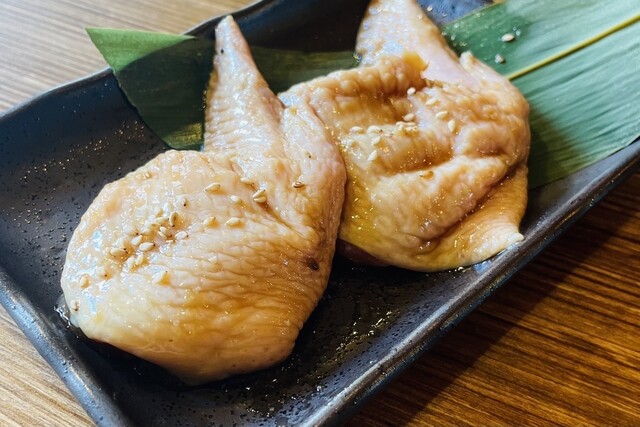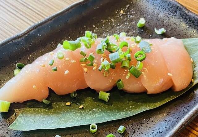 手羽元と胸の中間にあたる「ふりそで」。一羽でたった50g程度しか取れない超希少部位です。弾力のある肉質で、脂もさっぱりとしていてほどよいため、一度口にすると癖になる味わい!