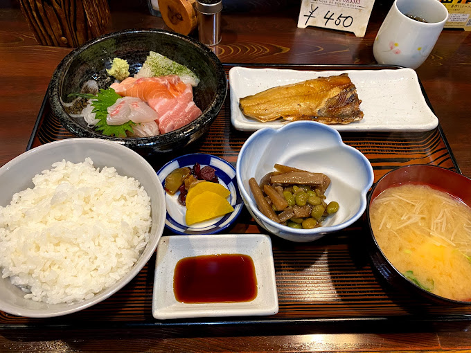 日替わり焼魚定食は720円で、焼き魚、味噌汁、小鉢、ごはんのセット。新鮮で脂の乗った魚が味わえ、コスパも良好。昼時はサラリーマンで賑わう。