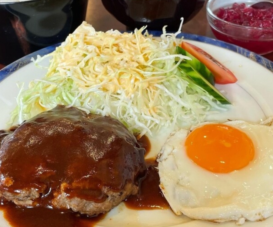つなぎ少なめで肉の旨みがしっかり感じられるハンバーグは、家庭的でやさしい味わい。ワンプレートには目玉焼きやスパゲッティーサラダ、サラダ、漬物などが盛られ、見た目以上にボリューム満点。定食メニューも豊富で、しっかり食べたい人にもおすすめの満足ランチが揃う。