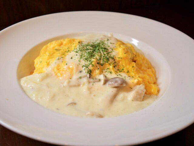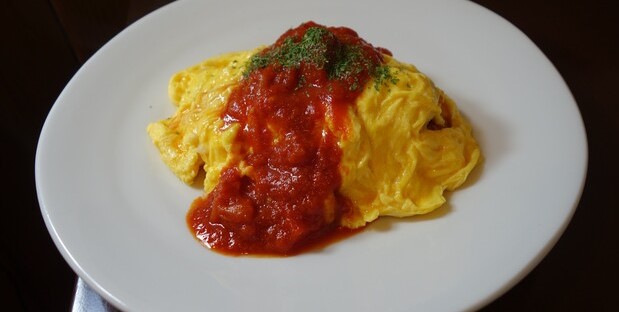 どれもおいしそうなメニューで迷いながらも、オムライス(トマト)を選択。半熟卵に、ケチャップで味付けされたチキンライスで最高の組み合わせ!しかもサラダとスープが付き!