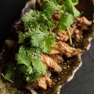 よだれ用のオリジナルダレに漬け込んだ鶏もも肉をボイルし、山椒の効いた仕上げダレとパクチーで仕上げたよだれ鶏!※パクチーなしパクチー別盛り出来ます。