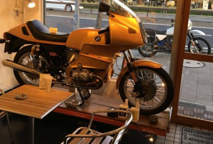 BMWバイクがディスプレイされたユニークなカフェ