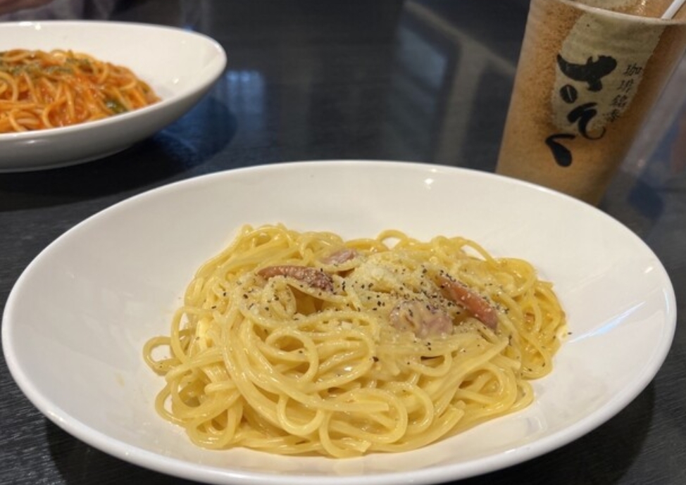 朝はバタートーストにゆで卵&ヨーグルトのモーニング、昼以降はパスタやワッフル、紅茶アイスなど多彩なメニューが揃い、どの時間帯も満足できます。