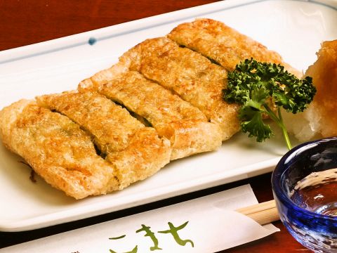 油揚げの中に納豆・オクラ・ちりめんじゃこ・とろろ・ねぎ・にら・たまごを詰めて揚げた一品。大根おろしで食べる元気包み揚げは絶妙なおいしさです。