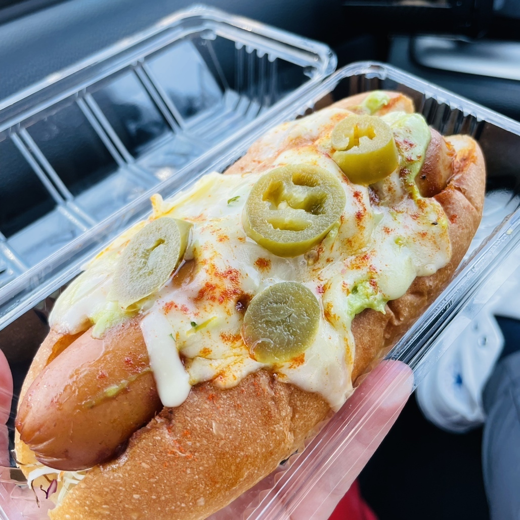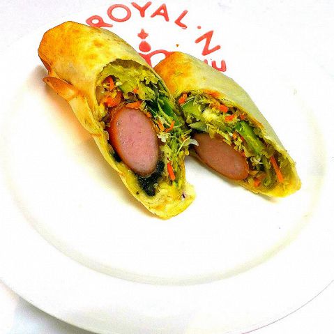ソーセージと野菜ソテー(タマネギ・ホウレンソウ・トマト・シイタケ)にジェノベーゼソースをかけトルティーヤで包んだ新商品☆ジェノベーゼソースはサワークリーム入りでヤミードックオリジナルソースです♪
