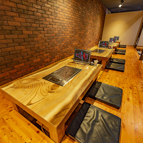 店内は、レンガの壁と木のテーブルで温かみのある落ち着いた空間を演出。広々としており、ゆったりとお過ごしいただけます。お席は、お一人様OKなカウンターとグループでの利用に最適なテーブル席と掘りごたつ席をご用意。少人数の団体様も歓迎しており、40名様での貸切も可能です◎40名様を超える場合はご相談ください!