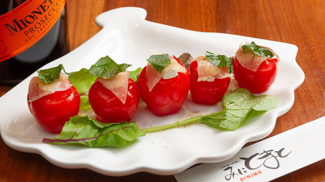 徳島産「阿波尾地鶏」のモモステーキ!低脂肪でコク・甘み・うま味が強く、適度な歯応えが特徴。そんな阿波尾鶏を存分に味わえり「モモステーキ」は、皮目をパリッと香ばしく焼くことで肉汁を閉じ込め、自家製タレをかけた自慢の一品です♪その他、季節の野菜の味わいを活かす「旬野菜のバーニャカウダ」、完熟トマトを湯むきしてバジルが香る特製マリネに漬け込んだ「まるごとトマトのマリネ」もワインに合うおすすめメニューです