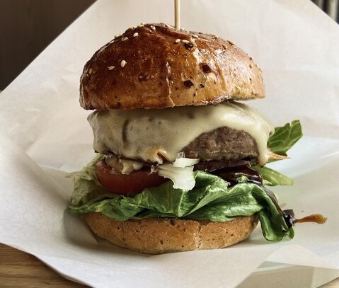 食パン専門店ならではのふわふわ感と黒豆の香りが絶妙な黒豆食パン。豆苦手な人でも大満足の味わい。冷たい黒豆茶もおすすめ。快適なテラス席で、至福のモーニングやランチを堪能できます。