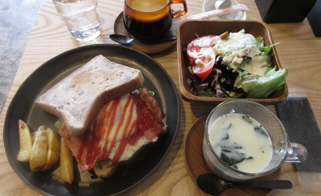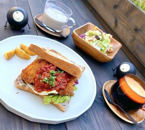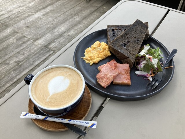 1階では黒豆食パンが販売され、2階のカフェではその食パンを使ったランチが楽しめます。川が見えるテラス席で、バラエティ豊かなランチプレートが人気です。