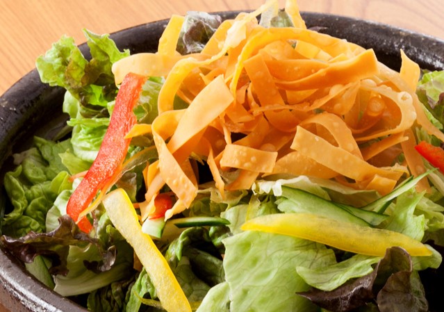 くいもの屋わんのお通しはサラダです。野菜を先に食べることで、急激な血糖値の上昇や糖の摂り過ぎを防ぐことができます。最後にあがり椀(お味噌汁)をサービスしております。