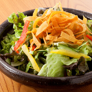 「くいもの屋わん」のおもてなしは、席に着いた時からはじまります。くいもの屋わんのお通しはサラダです。野菜を先に食べることでその後の糖質の吸収を穏やかにし、急激な血糖値の上昇や糖の摂り過ぎを防ぐことができます。またおかわり自由です。ドレッシングも指定できます。また、くいもの屋わんは、最後にあがり椀(お味噌汁)をサービスしております。お味噌汁を一杯飲んで、お帰りの前にほっと一息おつきください。
