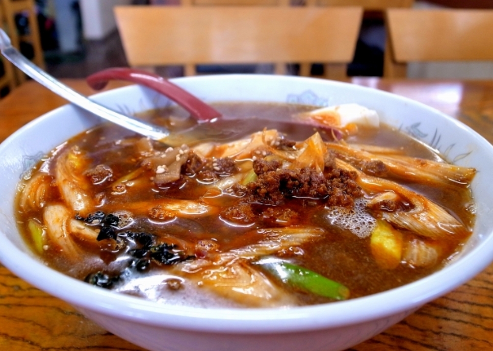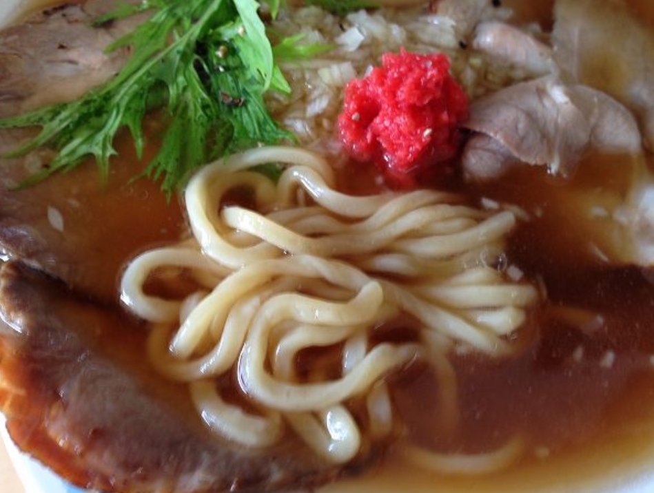 玉葱、モヤシなどのたくさんの炒め野菜がコクを出し、シャキシャキの食感が絶品。しょう油味と細麺の相性が良い。座敷には子供用の椅子が用意されている。
