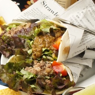 メキシカンやスパニッシュなど、ラテンテイストの逸品が揃うメニュー。メキシコ料理の代表「タコス」は、スパイシーなミートとサルサソースが絶妙にマッチする注文必至の一品!