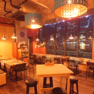 ウッド調の内装とオレンジの照明が温もりを感じさせる店内。大きな窓から望む景色が、さらに雰囲気を盛り上げてくれます!オープンキッチンになっている開放的な空間には、カウンター席、テーブル席の他、8名様までご利用いただける半個室席もご用意!