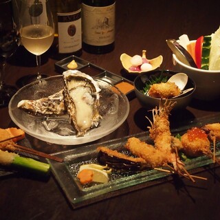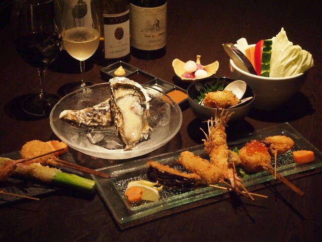 コースは揚げ立てを1本ずつご提供するスタイル。中でも「おまかせコース」は、お客様の約半数がご注文される人気プランです。オーダーストップ制ですので、旬の味覚・魚介・肉・野菜など多彩な食材を、心ゆくまでご堪能いただけます。止めるタイミングは自由。たくさん食べたい時はもちろん、小食の方にもおすすめです。品数によって料金が変わります。串15本の「季節コース」と、串11本の「えそらコース」もおすすめです。