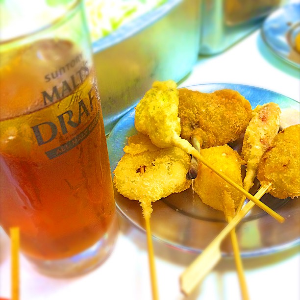 生ビールとともに、揚げたての串カツを堪能する大阪名物の名店
