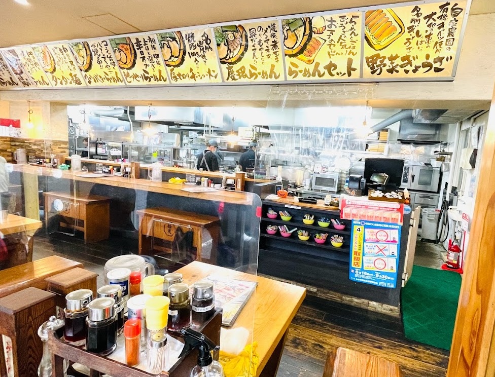 店内は清潔感があり、広々としたテーブル席でゆったりと過ごせます。駐車場も広く、家族連れやグループでの利用にも最適。漬物やニンニクがセルフサービスで提供されており、自分好みの味変ができるのも嬉しいポイント。スープのコクともちもちの自家製麺が絶妙に絡み合うラーメンを、ぜひ堪能してください!