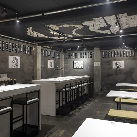 地下1階の隠れ家的な蕎麦居酒屋。広々としたカウンター席やゆったりとしたテーブル席で、落ち着いた時間を楽しめます。店内は和の雰囲気を大切にした内装で、浮世絵が飾られ、心地よい空間を演出しています。