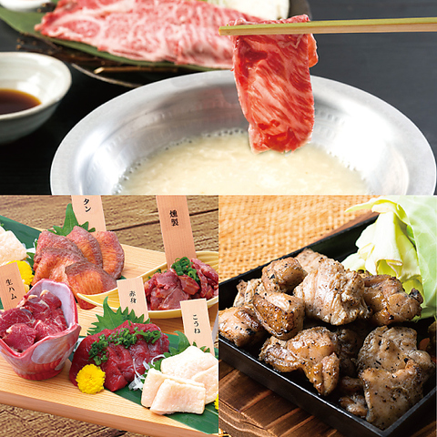 「和牛肩ロース肉の濃厚生姜豚骨しゃぶしゃぶ」を堪能♪「はかた地どりのももむね焼き」や「馬肉五種盛り合わせ」など豪華な九州料理にデザートも付いた全10品!更に生ビール、サワーや日本酒等充実の飲み放題付き♪