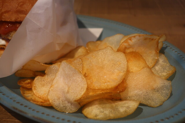 バーガーに添えられる楕円状の熱々プレートが特徴。揚げたての薄切りポテトチップスは、塩加減が絶妙で手抜きのない美味しさ。食事の満足度を高める一品です。