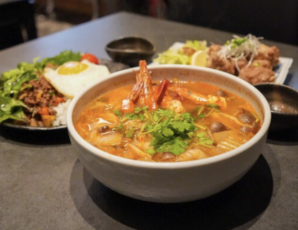 和食とタイ料理が楽しめる居酒屋。落ち着いた雰囲気の店内で、豊富なお酒とともに、本場の味を存分に堪能できます。特に「トムヤムクンラーメン」は、ビックリするほどのボリュームと絶妙な辛みと酸味が魅力です。