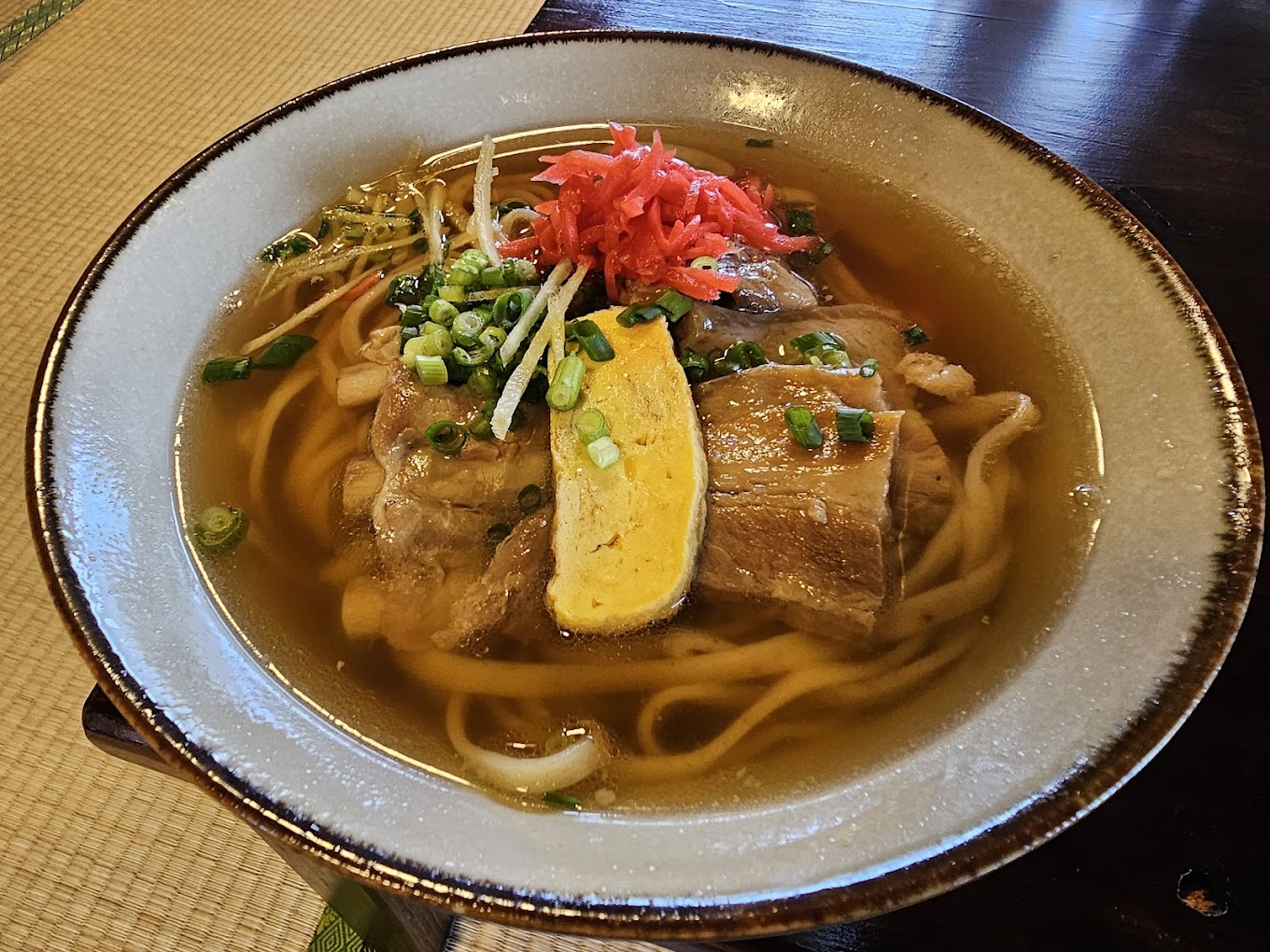 住宅街にひっそり佇む古民家風の沖縄そば屋。店内には三線の音楽が流れ、ゆったりとした空間で食事を楽しめます。薬味が別添えで提供されるなど、出汁の香りや素材の味を大切にしたこだわりが感じられます。