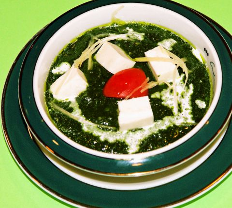 緑、白、赤の配色が目を引くホウレン草100%とインドチーズのカレー。コクのある濃厚なインドチーズのカレー。ベジタリアン・ビーガンの方にもお勧めのカレーです。
