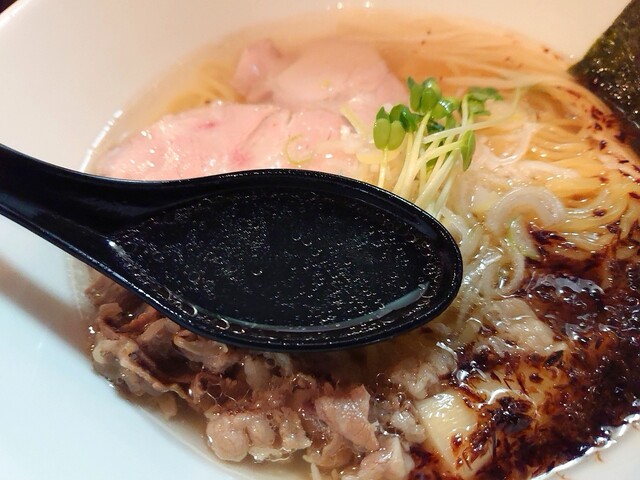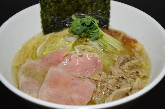 牛骨と宮崎牛の旨味が絶妙に融合し、青唐辛子の辛さと焦がしネギの風味が広がる。独創的なスープで、塩ラーメンの概念を塗り替える逸品です!