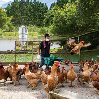 塚田農場看板商品の「地鶏炭火焼」。この地鶏は卵を産む親鳥を作るところから始まります。日々鶏たちが心身共に健康で過ごせるように生産者は鶏の目線で腰を屈めてお世話を続けます。