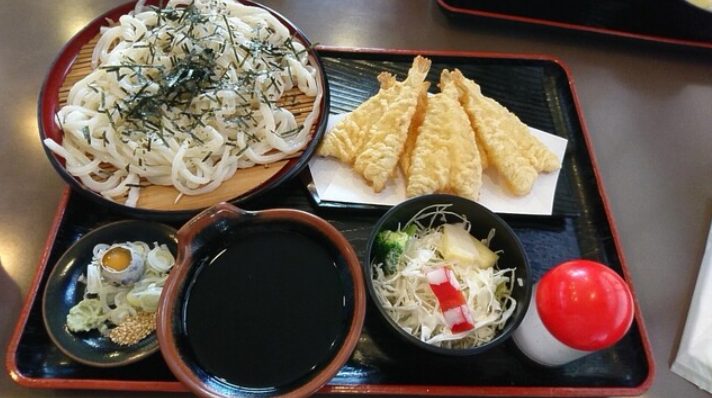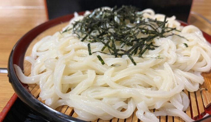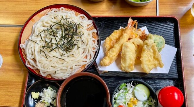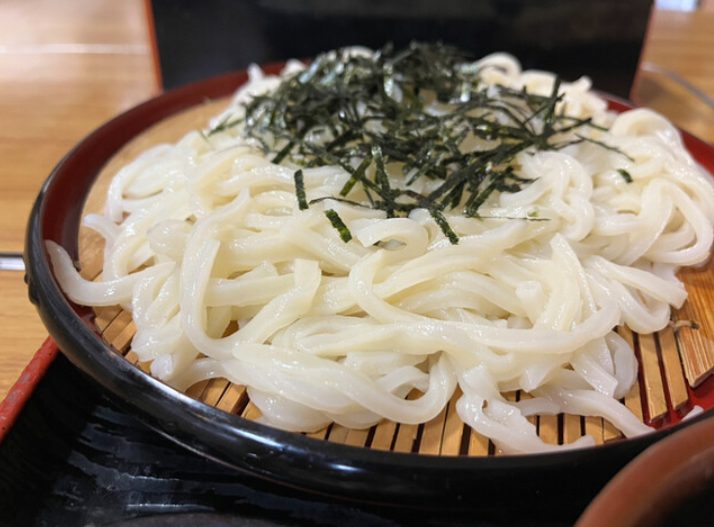 あたたかい季節に選ばれるのが天ざる。細めでつるりとしたうどんは、ほどよい弾力と軽やかな食感が特徴です。やや濃いめのつゆは、たっぷり添えられたごま・ねぎ・生姜で好みに調整可能。揚げたての天ぷらとともに、最後まで飽きずに楽しめます。