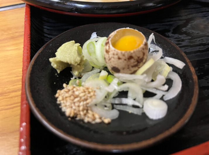 手打ち用小麦粉に伯方の塩、浄水した水を合わせたうどんは、柔らかさの中にぷにゅっとした歯ごたえ。打ち立て・茹でたてならではの角立ちが品質を物語ります。鰹・鯖・うるめ節を季節で配合した出汁は辛口でキレがあり、うずらの玉子付きの薬味も嬉しいポイントです。