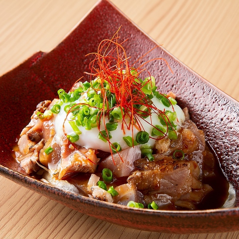 歯ごたえが癖になる『種鶏モモタタキ温泉卵ユッケ』