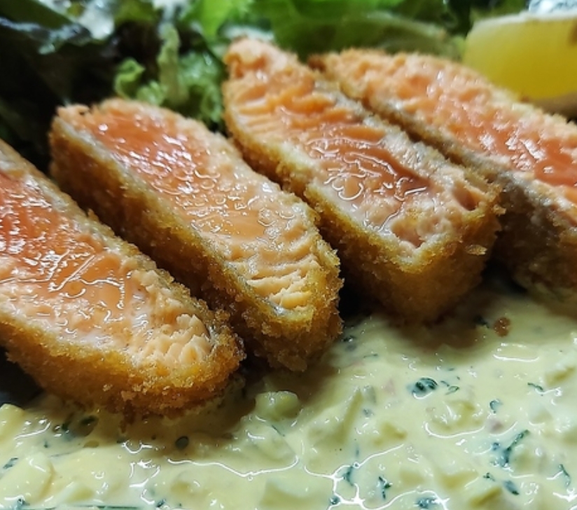 銀鮭養殖のパイオニア・鈴木欣一郎から親子三代にわたり守り続けるブランド銀鮭「銀王」。宮城女川から「世界に誇れる銀鮭」をレアカツに仕上げました。自家製手作りのタルタルソースで召し上がり下さい。