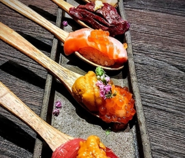 女性のお客様大喜び、食べやすく、美味しく、嬉しい、スプーン寿司の5種盛り合わせです。勿論、男性のお客様も大絶賛!!