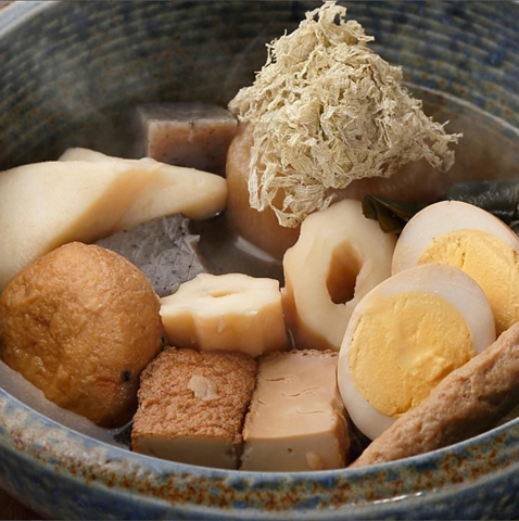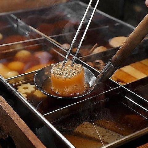 鰹節、国産昆布、牛すじ肉をベースにとったこだわりの“だし”をじっくり染み込ませたおでんは当店自慢の逸品!大根、玉子、こんにゃく、白滝、じゃが芋、つみれ、牛すじ、昆布、さつま揚など、人気おでんを各種ご用意!